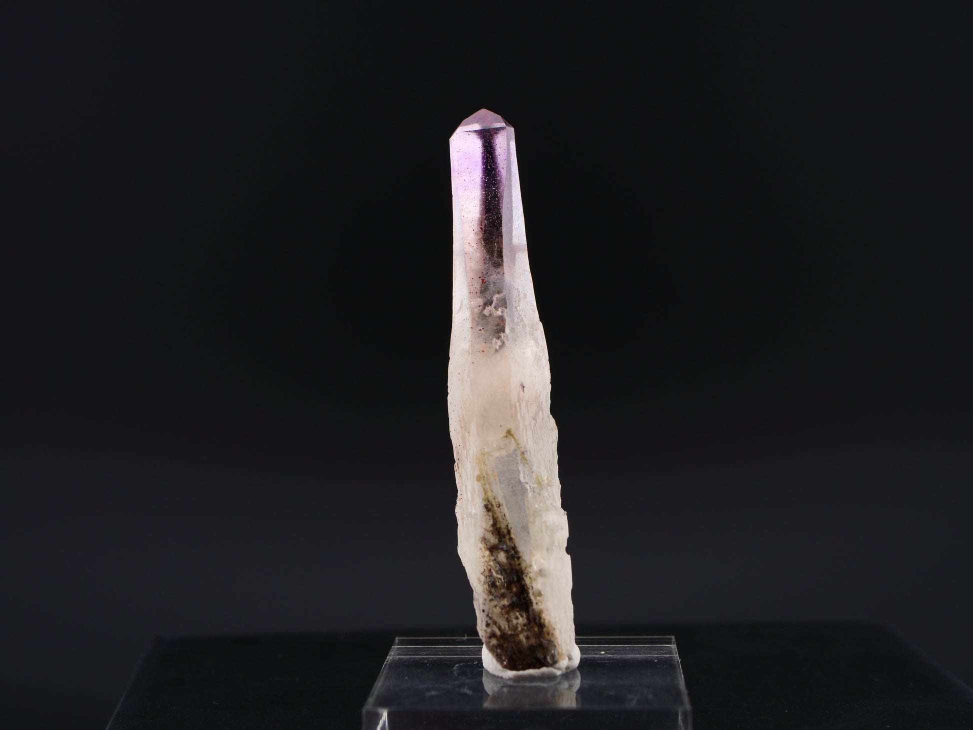 Tapered light amethyst point with a colorless quartz lower section. Neat single point from a classic location.
