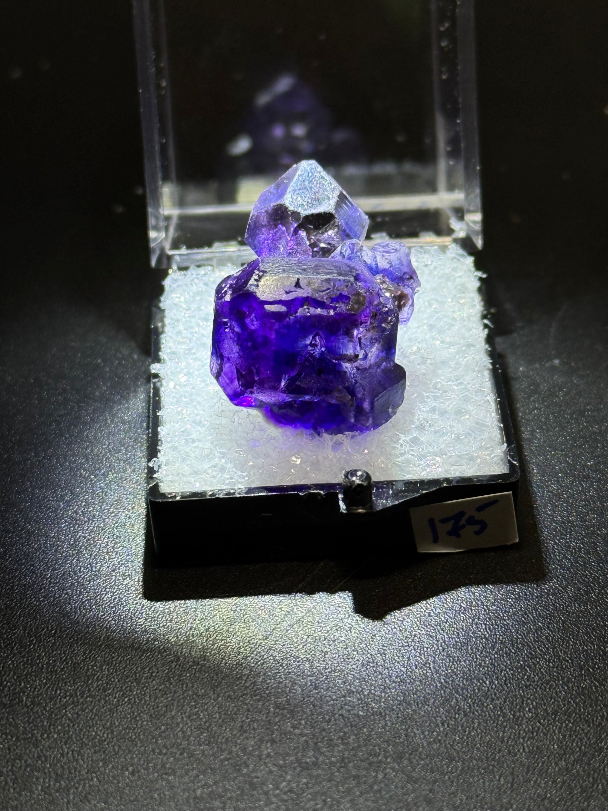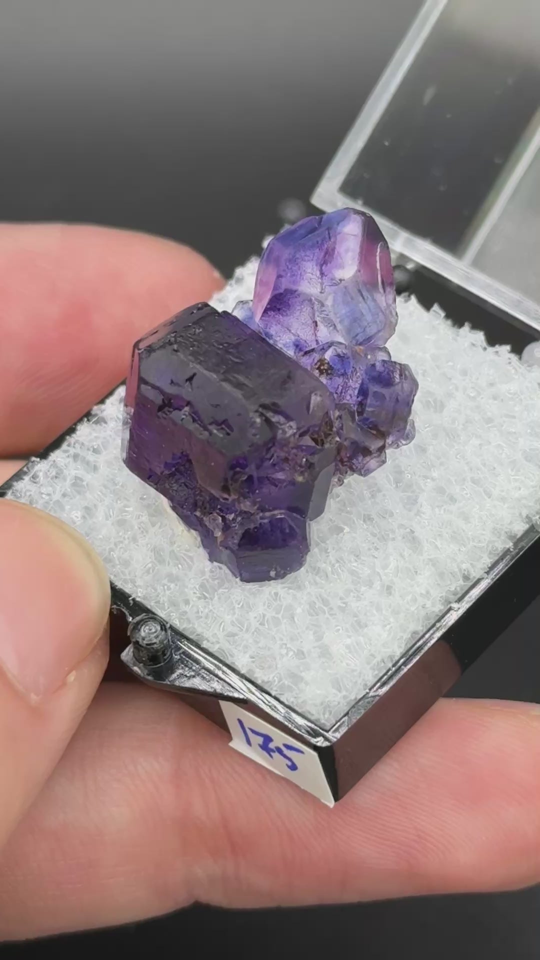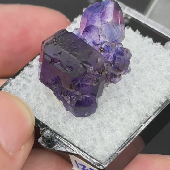 Purple with blue zoning fluorite from a recent find in Argentina. Cluster of well formed crystals with different habit and great clarity on the top crystal.