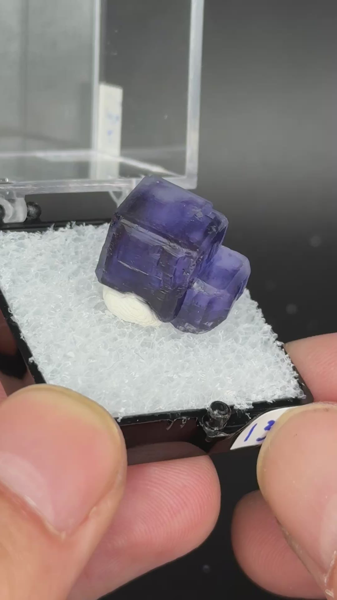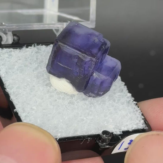 Fluorite from a recent find in Argentina. Excellent shape with two cubic crystals. This specimen exhibits a small green color zone along the edge that can be seen when viewed from the top.