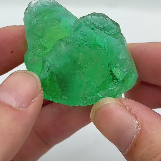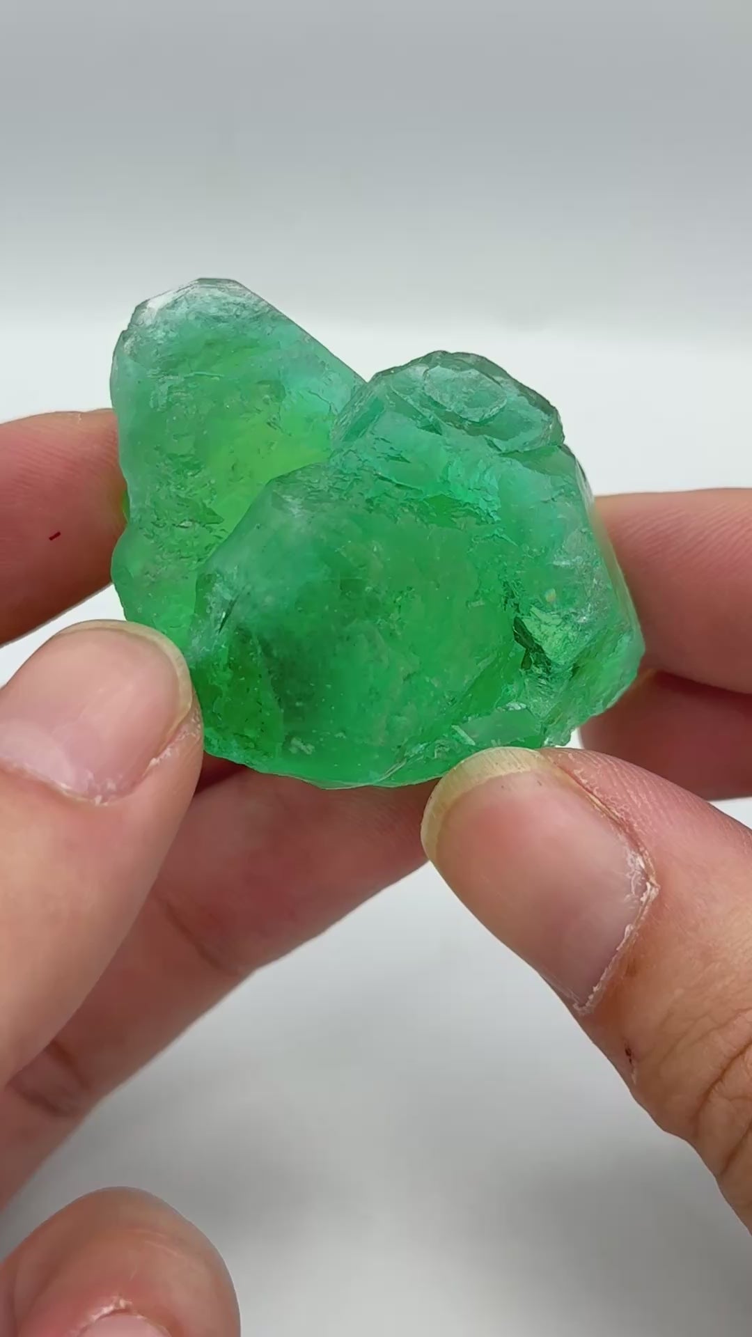 Bright green fluorite cluster with dodecahedron, octahedral and cubic faces all showing on one specimen. Glows beautifully in a display case or sunlight. Great color with a bluish zone on the edges of the crystal