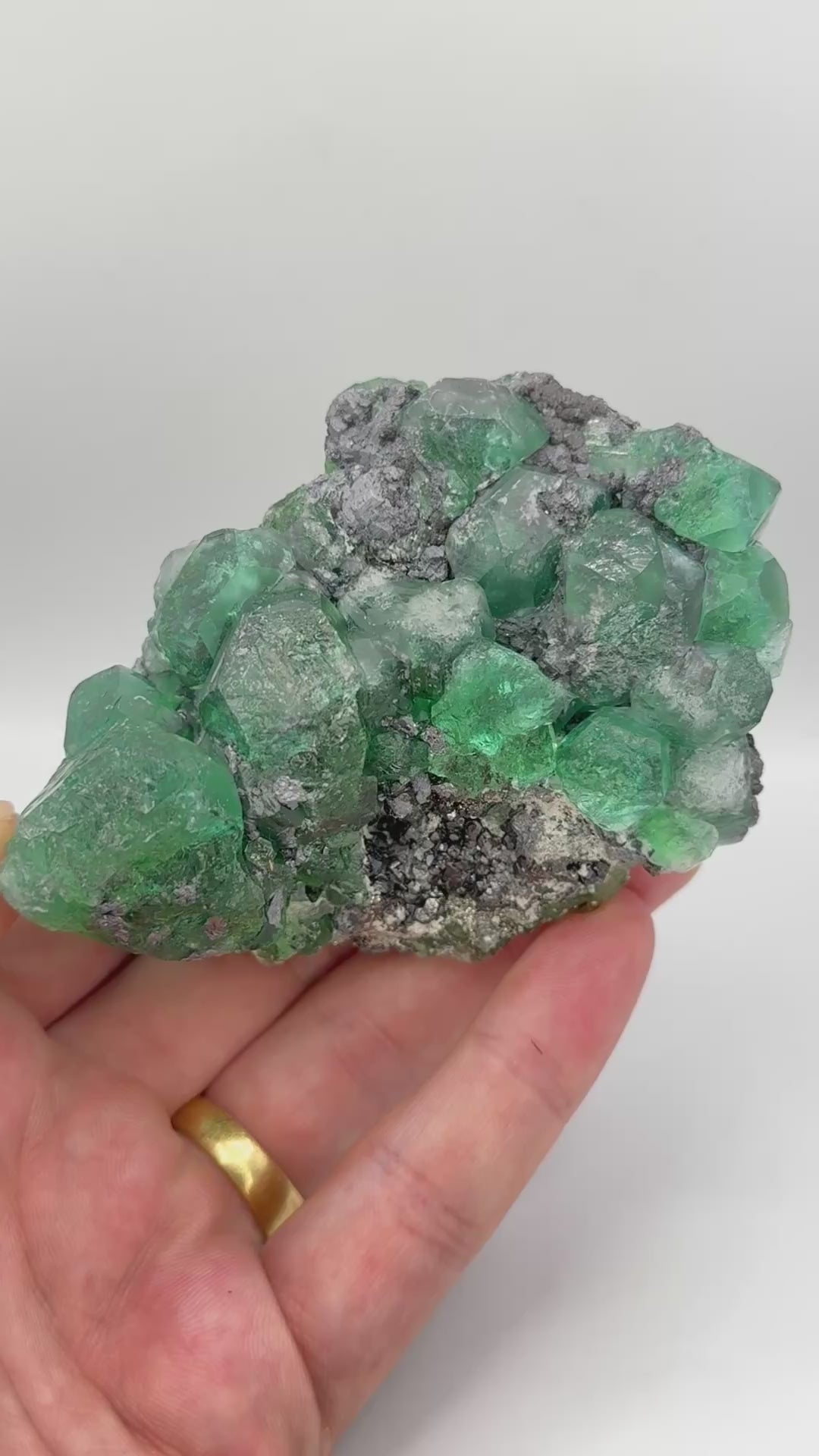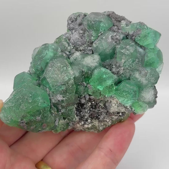 Slightly bluish green fluorite crystals with geocronite, pyrite, sphalerite and boulangerite.