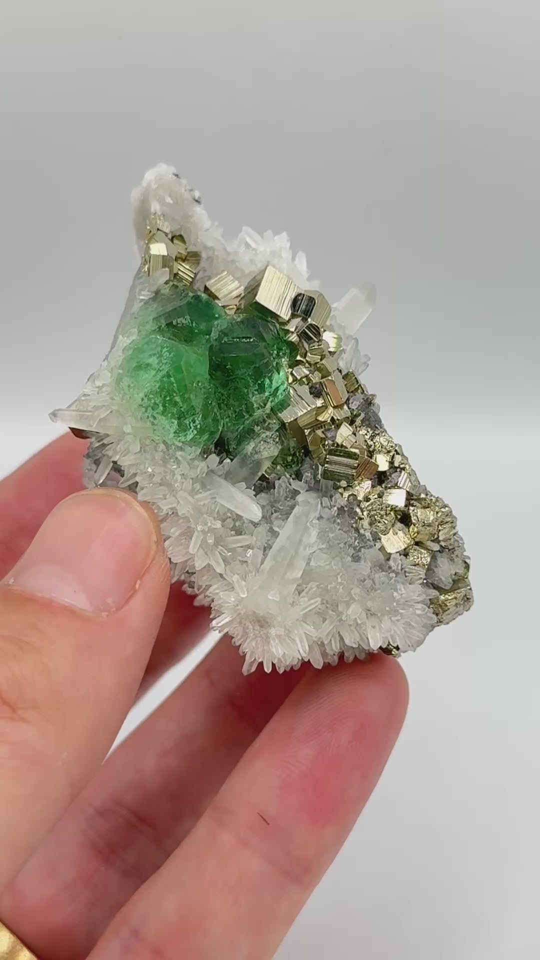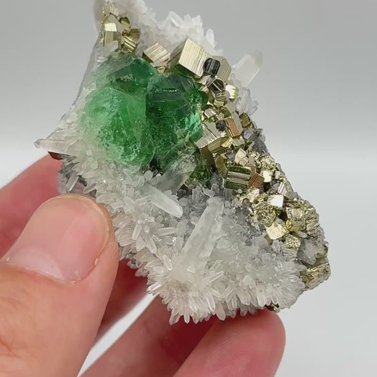 Fluorite on quartz with pyrite. Great condition and aesthetic specimen.