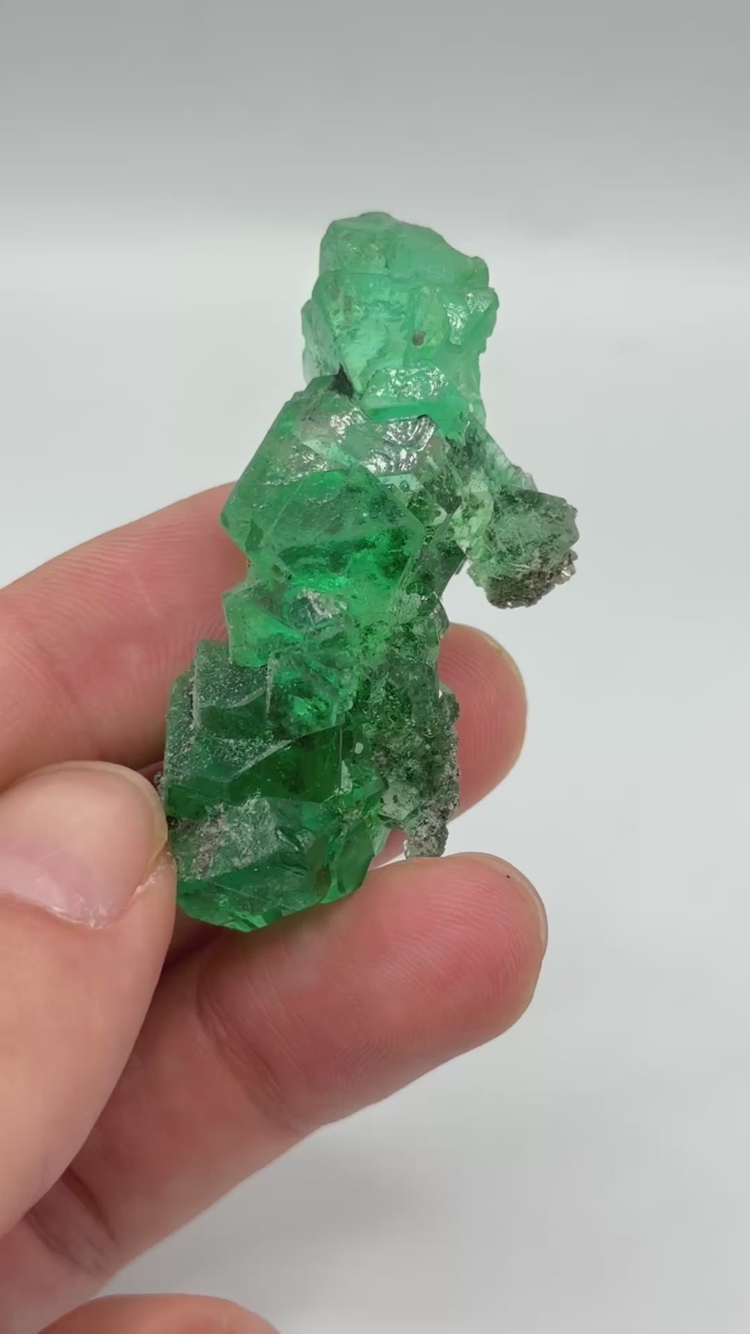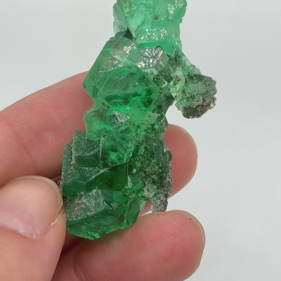 Chain of bright green octahedral fluorite crystals. Great color and clarity with some pyrite. Very aesthetic example.