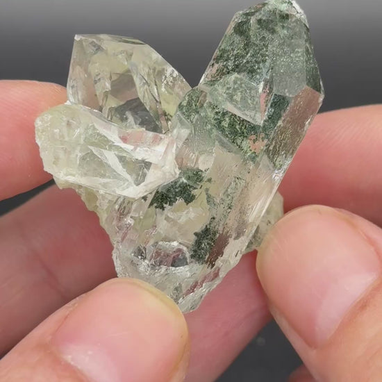 Two inter grown gem quartz crystals with excellent luster and moss like green chlorite inclusions