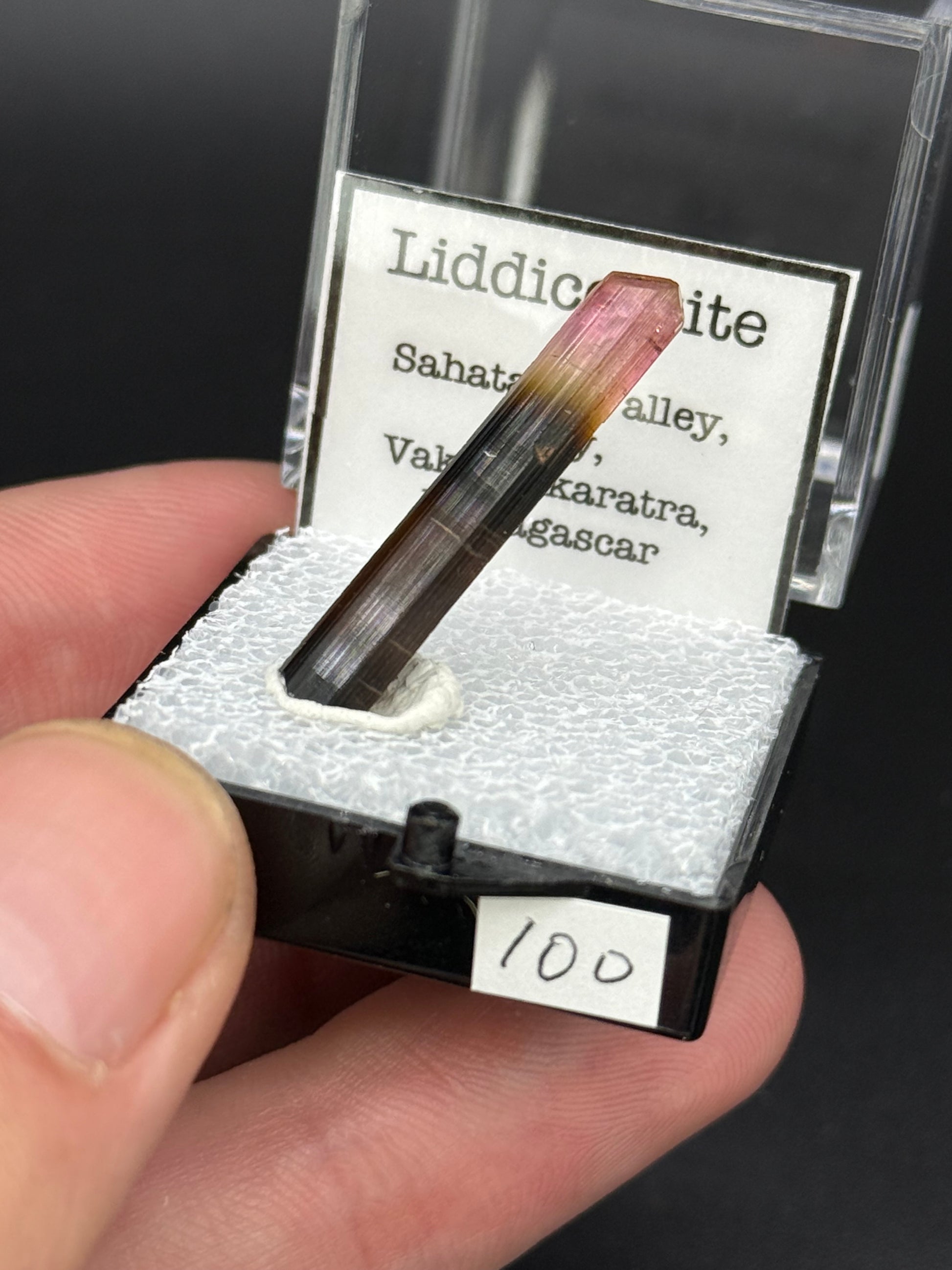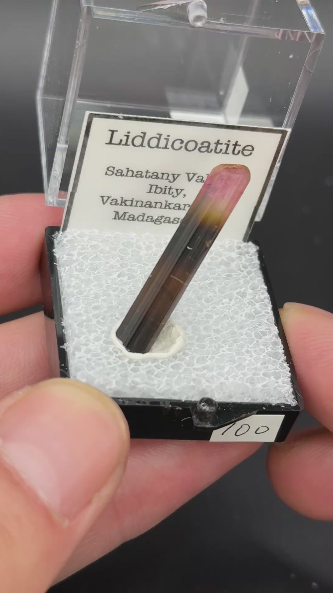 Liddicoatite pencil with bright pink termination yellow and brown zoning.