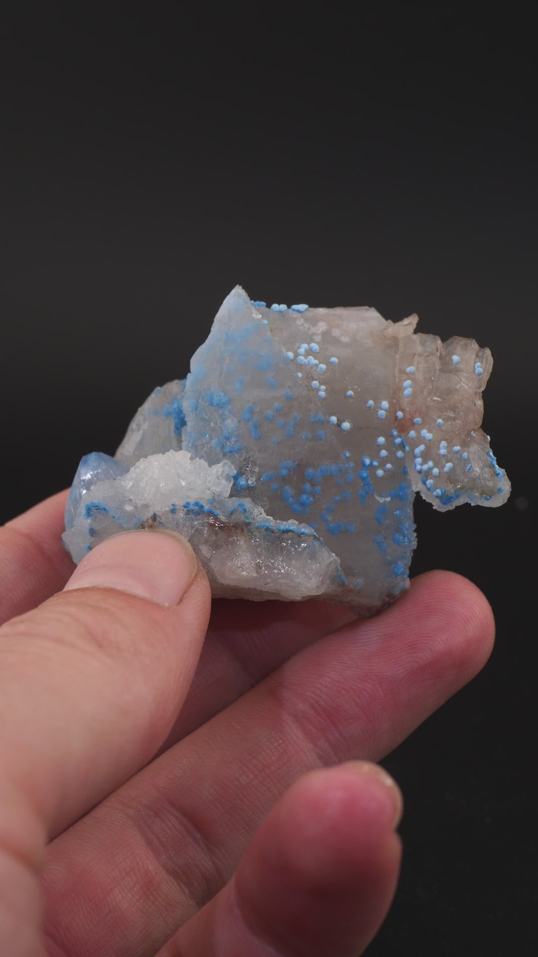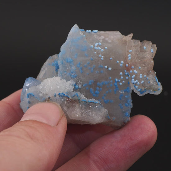 Nice terminated quartz points growing together. This piece has darker blue shattuckite orbs inside and lighter blue growing on the surface.